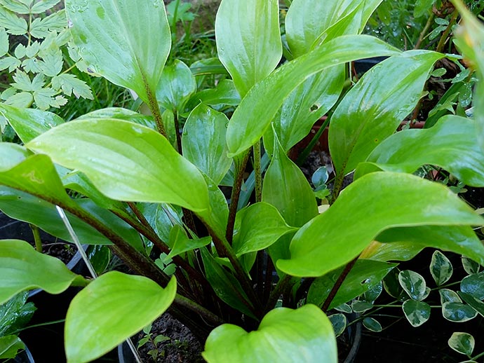 Хоста «Драма Квин» (Hosta Drama Queen) — гибридная хоста высотой 60 см — очень крутой сорт, у него листья — ладошки смотрят вверх и лучше всего показывают красные ноги. Цветы фиолетовые, на пурпурных черешках, в тон красных ножек. Редкий сорт.