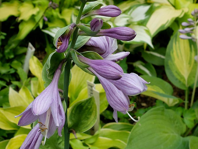 Цветы не главная фишка Little Hobber (как, например, у ароматных хост), но они приятны: привлекают пчёл и других опылителей, создают контрастный фон к листве. Удалять цветоносы или оставлять — дело вкуса. Если хотите сосредоточить энергию на развитии листвы, срежьте цветоносы в начале цветения; если нравится зрелище — дайте цветкам раскрыться.