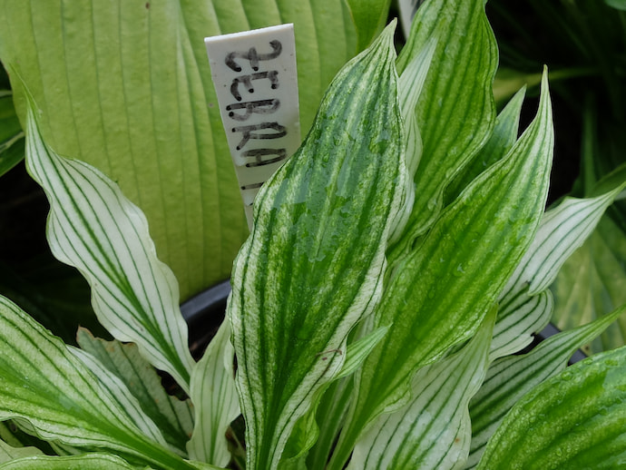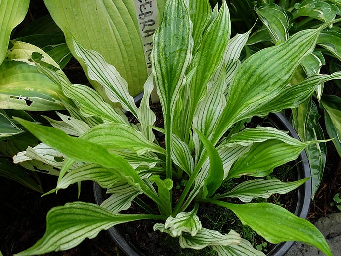 Хоста ‘Zebra Print’ — эксклюзивный тетраплоидный спорт сорта ‘White Feather Improved’. Этот компактный коллекционный сорт с узкими волнистыми листьями весной появляется кремово-белым, а затем постепенно зеленеет, создавая уникальный полосатый рисунок.