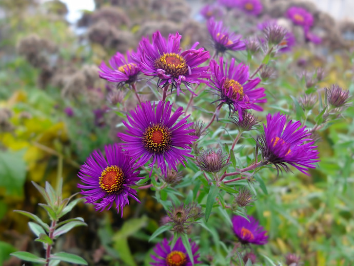 Астра новоанглийская фиолетовая (Aster novae-angliae) — роскошный осенний многолетник, который цветёт в конце лета, когда сад готовится к зиме. Куст высотой до 170 см украшен десятками крупных фиолетовых цветов с золотистой серединкой. Цветение продолжается с сентября по ноябрь, вплоть до первых морозов.
